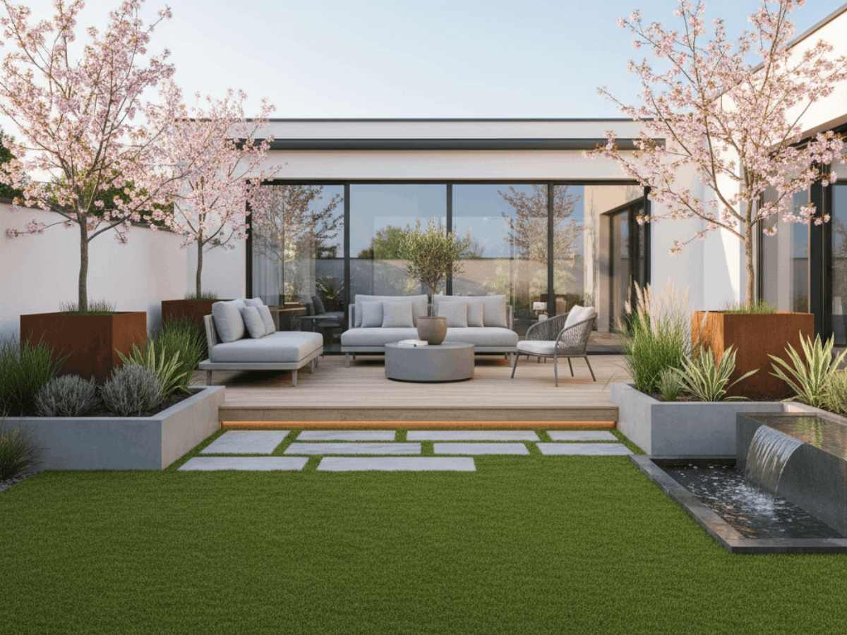 tendències jardins 2026. Descobreix les tendències de jardins i terrasses en 2026. Gespa artificial i disseny pràctic per a un espai exterior funcional.